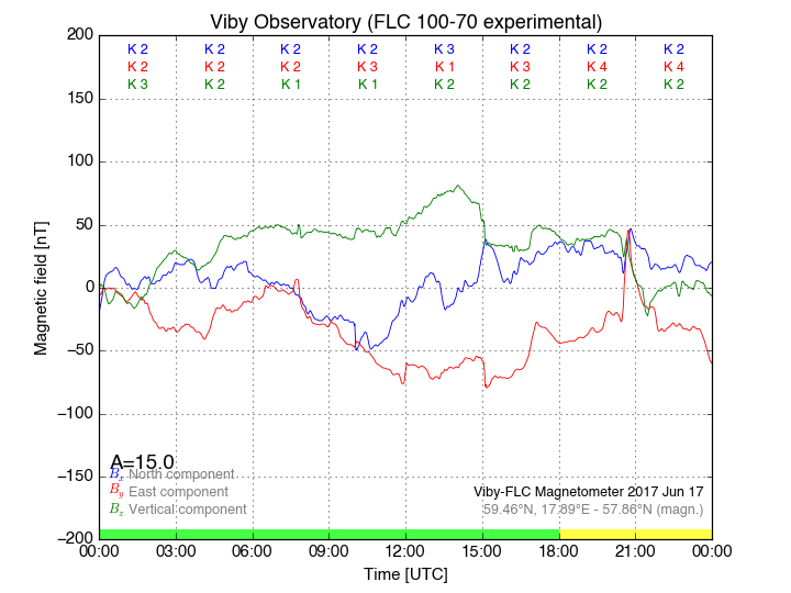Magnetometer Viby Viby (Sollentuna), Sweden · geographic coordinates: 59°27' N 17°54 E · geomagnetic coordinates (2017): 57.69°N, 106.22°E |