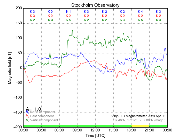 Magnetometer Viby Viby (Sollentuna), Sweden · geographic coordinates: 59°27' N 17°54 E · geomagnetic coordinates (2017): 57.69°N, 106.22°E |