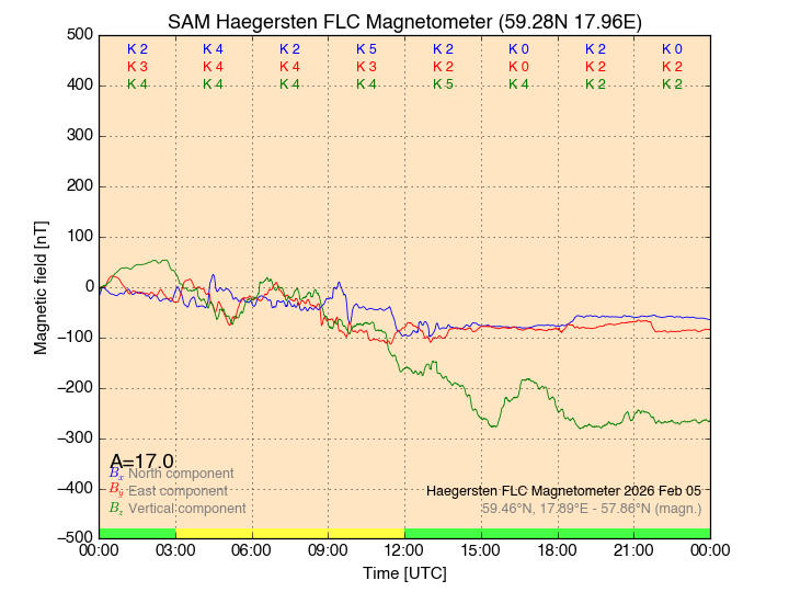 Magnetometer Viby Viby (Sollentuna), Sweden · geographic coordinates: 59°27' N 17°54 E · geomagnetic coordinates (2017): 57.69°N, 106.22°E |